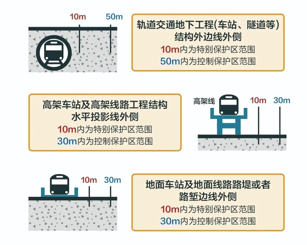 为避免周边工程施工、勘探等外部作业出现侵入轨道交通结构的行为(简称“侵界”行为),影响轨道交通建设及运营安全。轨道交通车辆在轨道交通线路上运行,必须确保线路结构有一个安全的空间,依据有关规定,在轨道交通结构及周边的特定范围内设置的控制和保护区域。《南通市轨道交通条例》明确了地铁安全保护区(一般为结构外边线周边50m内)和特别保护区(一般为结构外边线周边10m内)范围。