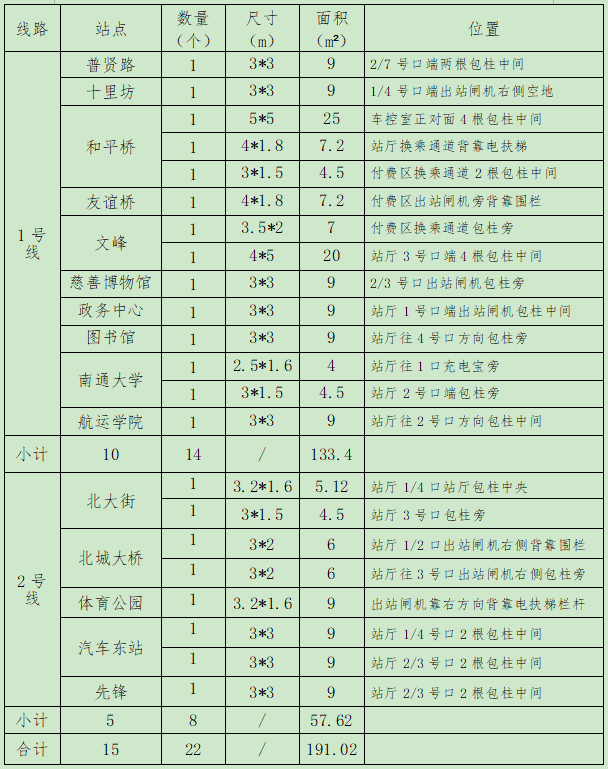 1、坐落位置及出租面积:标的位于今日看料 1、2号线车站站厅层,共计15个车站,合计面积为191.02㎡,具体空间点位如下表,具体位置详见附件1;