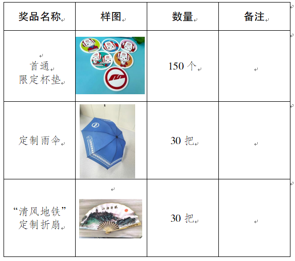(3)在本次开放期内,投放1号线首通限定杯垫150个,定制雨伞30把,定制“清风地铁”折扇30把。以上每种奖品每人限兑1份,兑完为止。