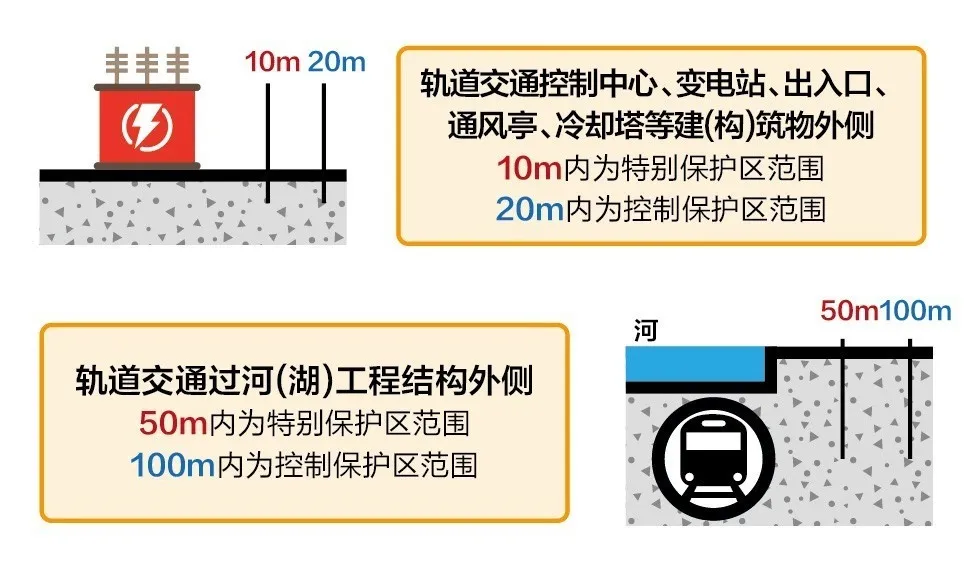 为避免周边工程施工、勘探等外部作业出现侵入轨道交通结构的行为(简称“侵界”行为),影响轨道交通建设及运营安全。轨道交通车辆在轨道交通线路上运行,必须确保线路结构有一个安全的空间,依据有关规定,在轨道交通结构及周边的特定范围内设置的控制和保护区域。《南通市轨道交通条例》明确了地铁安全保护区(一般为结构外边线周边50m内)和特别保护区(一般为结构外边线周边10m内)范围。