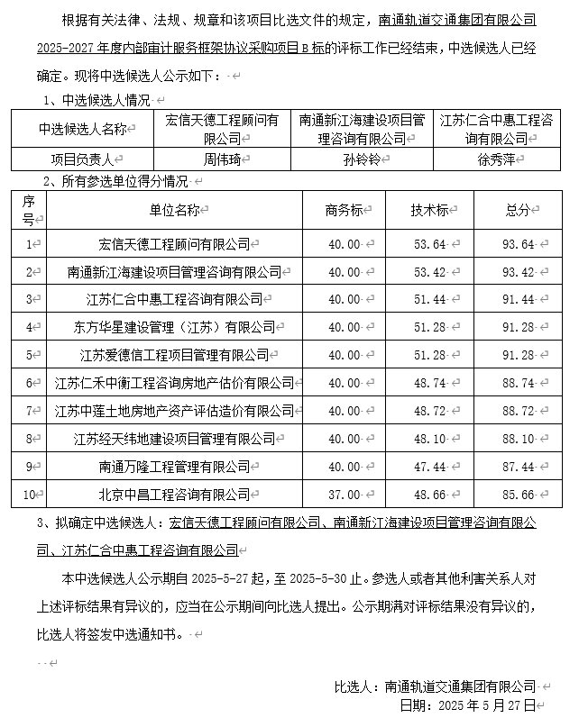 今日看料 2025-2027年度内部审计服务框架协议采购项目B标中选候选人公示